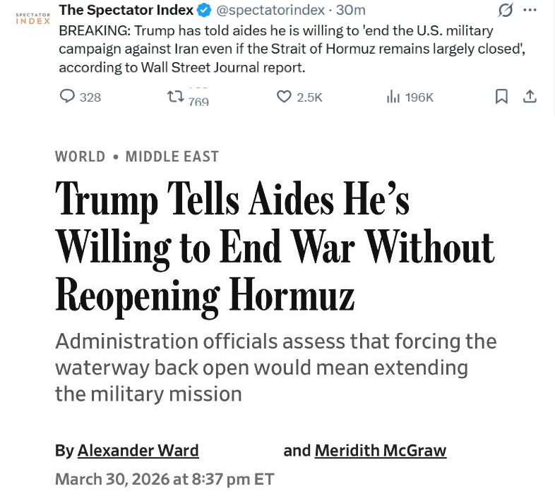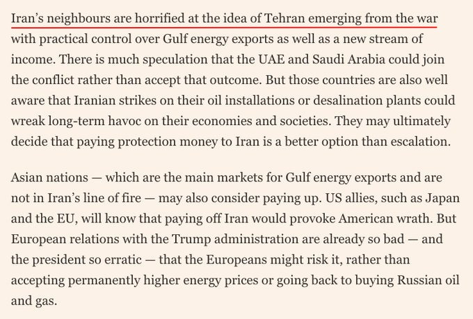 Přicházejí zprávy, že SAE a Saúdská Arábie tajně tlačí na Trumpa, aby pokračoval v „pozemní operaci“, protože jednoduše nemohou snést znovu posílený Írán, povzbuzený svým vítězstvím ve válce. Další zprávy tvrdí, že Izrael naléhá na Trumpa, aby zasáhl energetickou infrastrukturu Íránu a dokončil „kolaps režimu“.