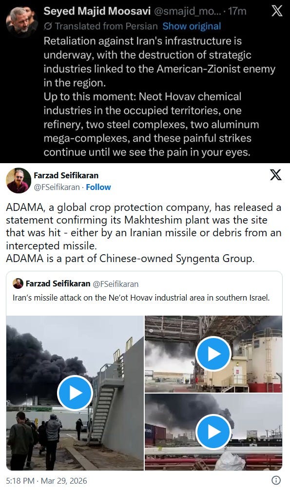 Mimochodem, v rámci probíhající odvety Írán záhy odpověděl a vypálil izraelské ocelářské komplexy krátce poté, co byly zasaženy ty íránské:
