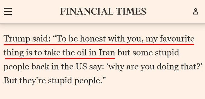 Porovnejte výše uvedené video z 80. let, v němž Trump opakovaně vyzývá k „zabrání íránské ropy“, s jeho novým rozhovorem pro Financial Times, který nyní koluje a v němž říká přesně totéž: